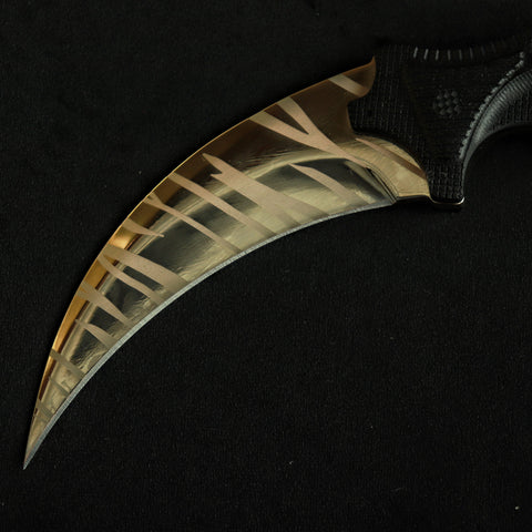 The knife looks almost exactly the same as the sharp version. The only difference is that the edge where the blade would be sharpened is left untouched. This results in slightly more of the original finish being left on the blade.